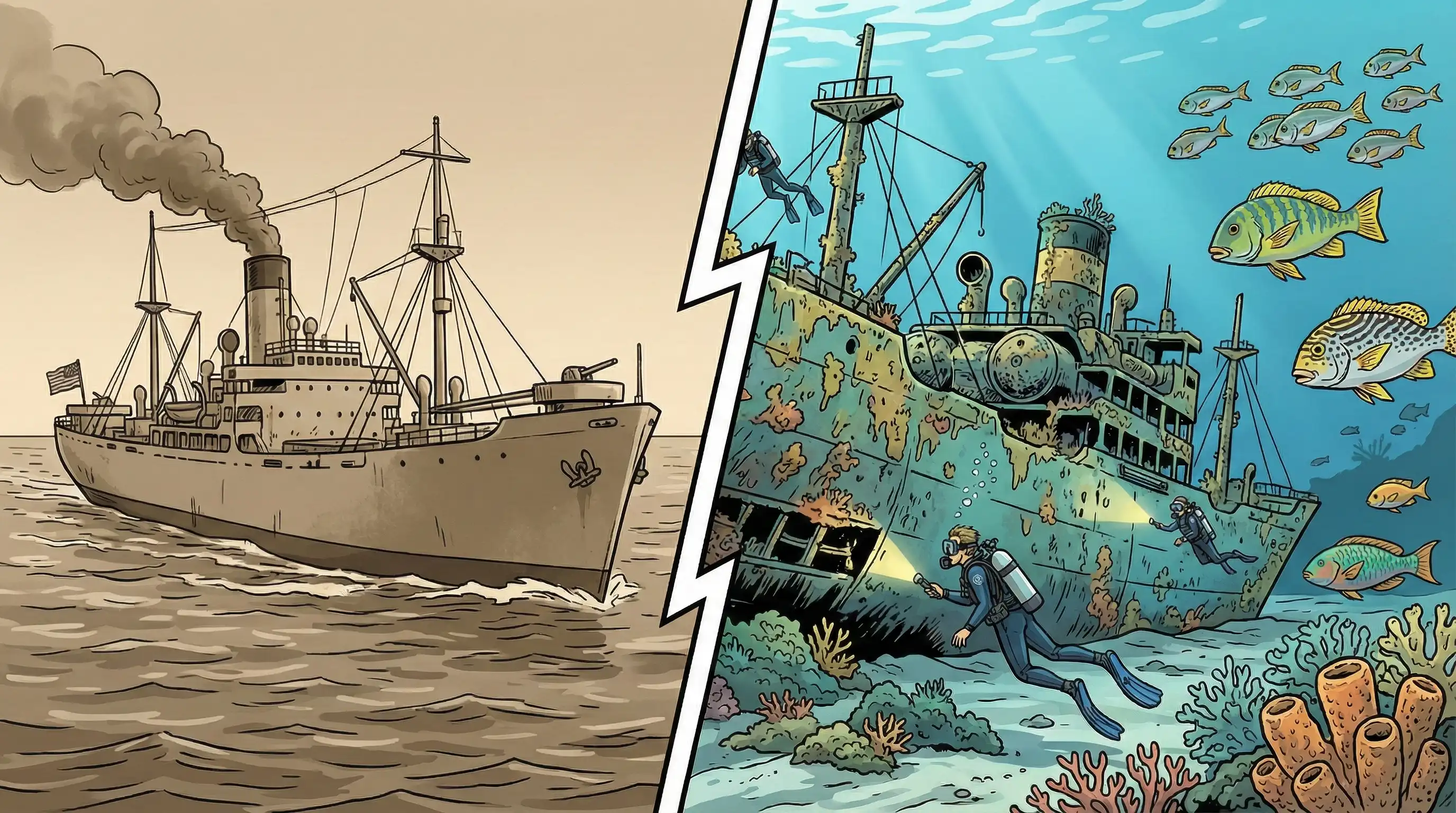 Over the following 60+ years, nature transformed this World War II relic into a living reef. Corals colonized every surface, fish populations established territories, and the Liberty shipwreck evolved into an ecosystem that now rivals natural reef systems in biodiversity.