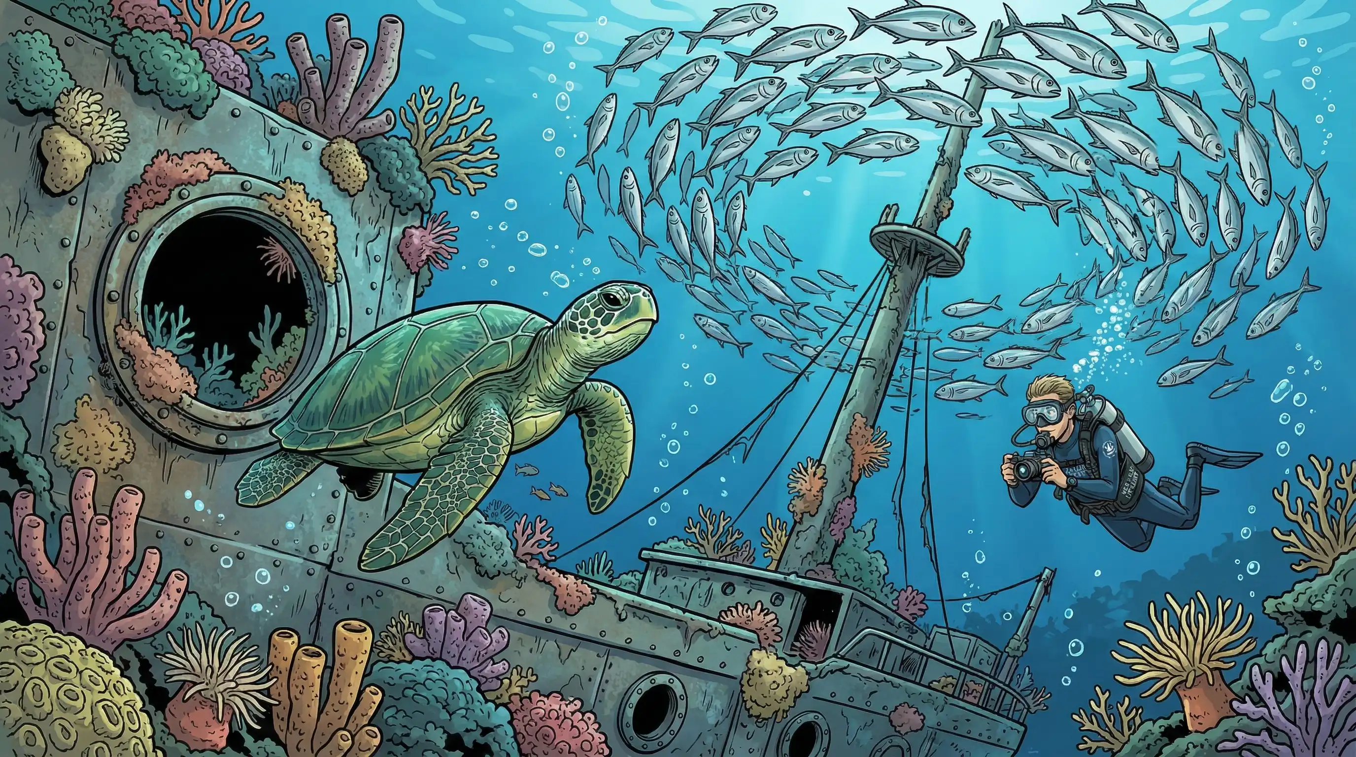 - Ascending return â Follow the hull upward through coral gardens, maximizing bottom time in the shallow zones where fish life concentrates